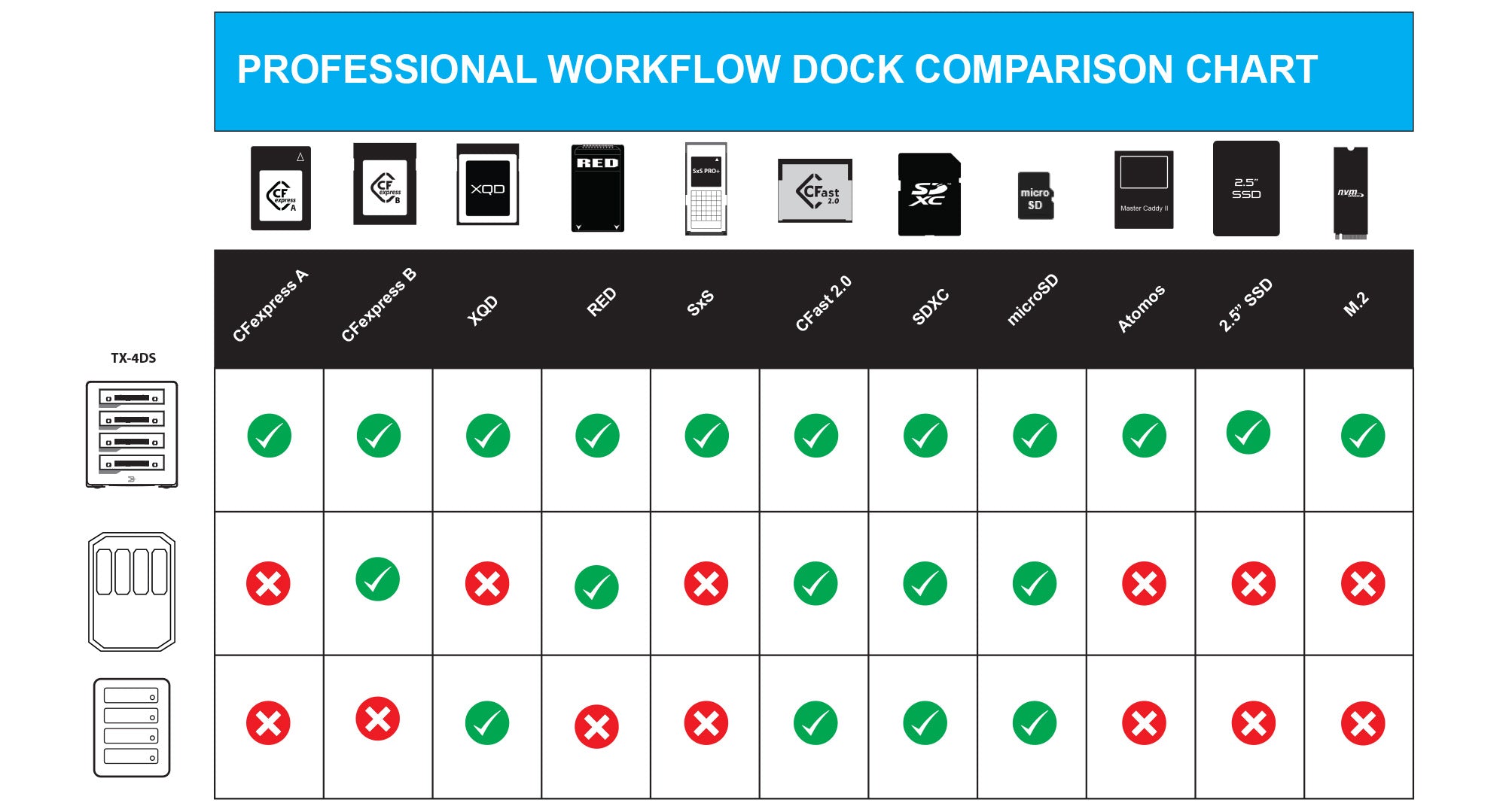 Customize your Workflow with the DX Series modules. Supports RED MINI-MAG, CFexpress A , CFexpress B, CFast, XQD, SxS, SDXC, Atomos, 2.5" SSD, and M.2 NVMe media cards.