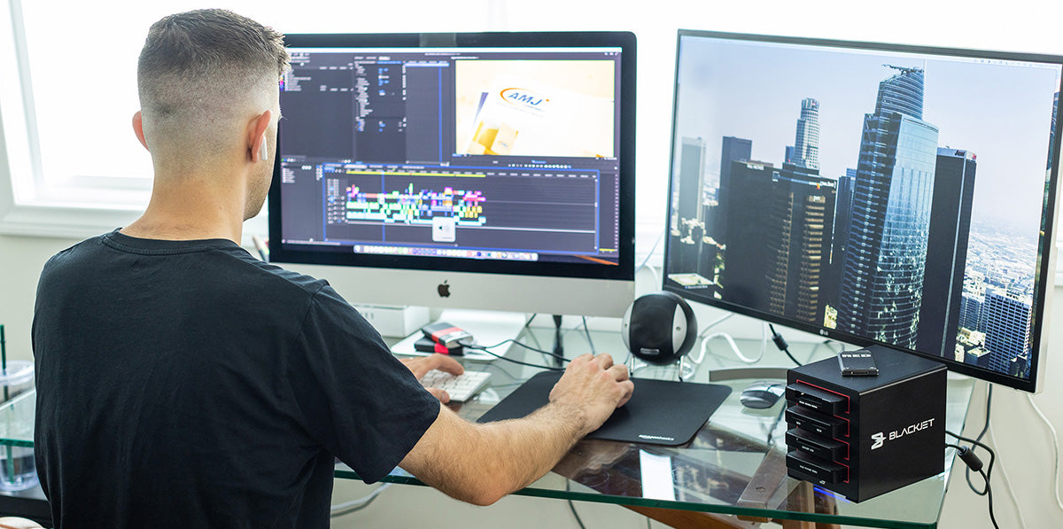 The Blackjet TX-4DS utilizes the large bandwidth 40Gbps of Thunderbolt™ 3, which allows you to ingest, edit and archive your creative content simultaneously at their maximum speeds. The user can customize their workflow depending on the type of media used. The TX-4DS utilizes the large bandwidth 2,750 MB/s of Thunderbolt™ 3, which allows you to ingest, edit and archive your creative content simultaneously at their maximum speeds.